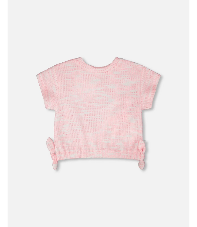 This pink and white jacquard knit tee features a subtle textured pattern that adds depth while keeping the look simple and wearable. The relaxed fit and lightweight fabric make it perfect for warm days, while the side tie detail gives it a playful finish.