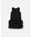 The Deux par Deux Sleeveless Bi-Material Lurex Dress in Black combines sleek glamour with playful texture. Crafted from shimmering lurex fabric, this dress is elevated by a dramatic feather-trimmed hem. Perfect for holiday parties, special celebrations, or any occasion where a bold, confident look is required.