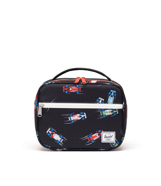 Featuring an insulated main compartment, a front zip pocket for snacks or utensils, and an easy-carry top handle, this lunch box balances practicality with Herschel’s signature design. Finished in the playful Race Cars print, it pairs perfectly with matching backpacks and accessories.