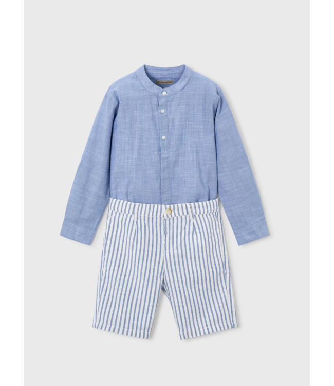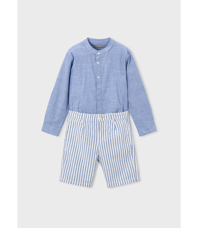 This classic two-piece set from Mayoral is designed for effortless summer dressing. The long-sleeve linen shirt comes in a soft indigo tone with a clean, tailored look, while the coordinating striped shorts add a playful, polished contrast.