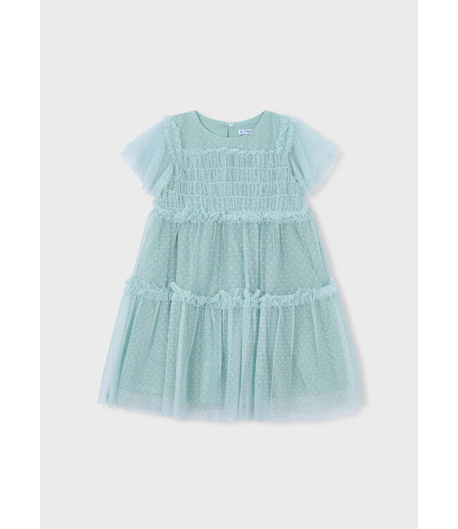 This plumeti tulle dress features a soft lake blue hue with subtle dotted texture throughout. The smocked bodice provides a comfortable fit, while the layered tulle skirt creates gentle volume and movement.