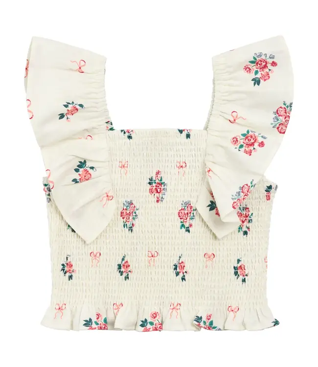 This woven flutter sleeve top features a delicate all-over floral print on a light base. The smocked bodice offers a comfortable stretch fit, while the flutter sleeves add an airy, feminine touch.
