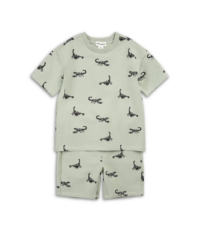 This infant two-piece set includes a soft short sleeve sweatshirt-style tee and matching knit shorts, both featuring an all-over scorpion print on a light green base. Made from comfortable stretch knit fabric, it’s designed for movement, play, and all-day wear.
