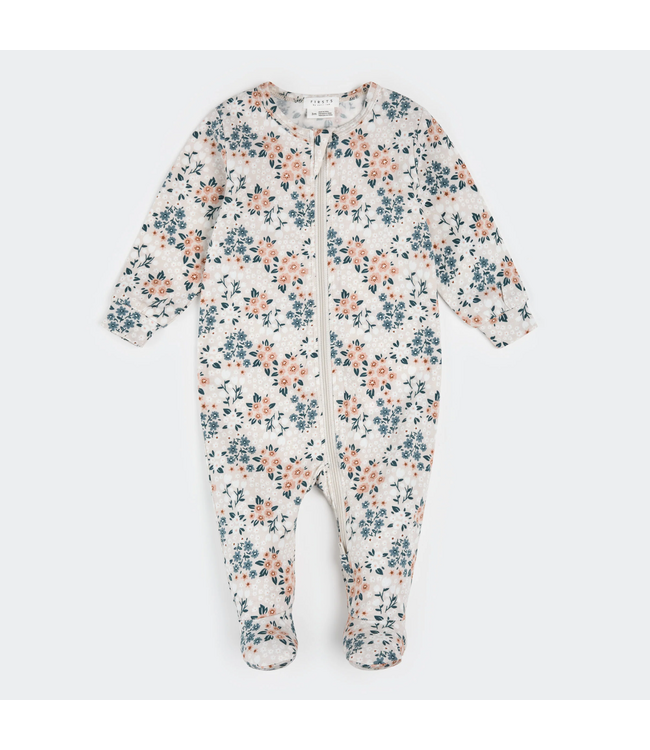 This Petit Lem footed sleeper features a delicate spring floral print on a warm cream base. Made from breathable organic cotton rib, it’s gentle on sensitive skin and perfect for comfortable sleep.