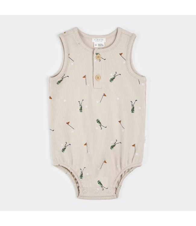 This Petit Lem ribbed bubble romper features an all-over golf caddy print on a soft sand base. Made from breathable organic cotton rib with a touch of stretch, it’s gentle on sensitive skin and perfect for warmer weather.